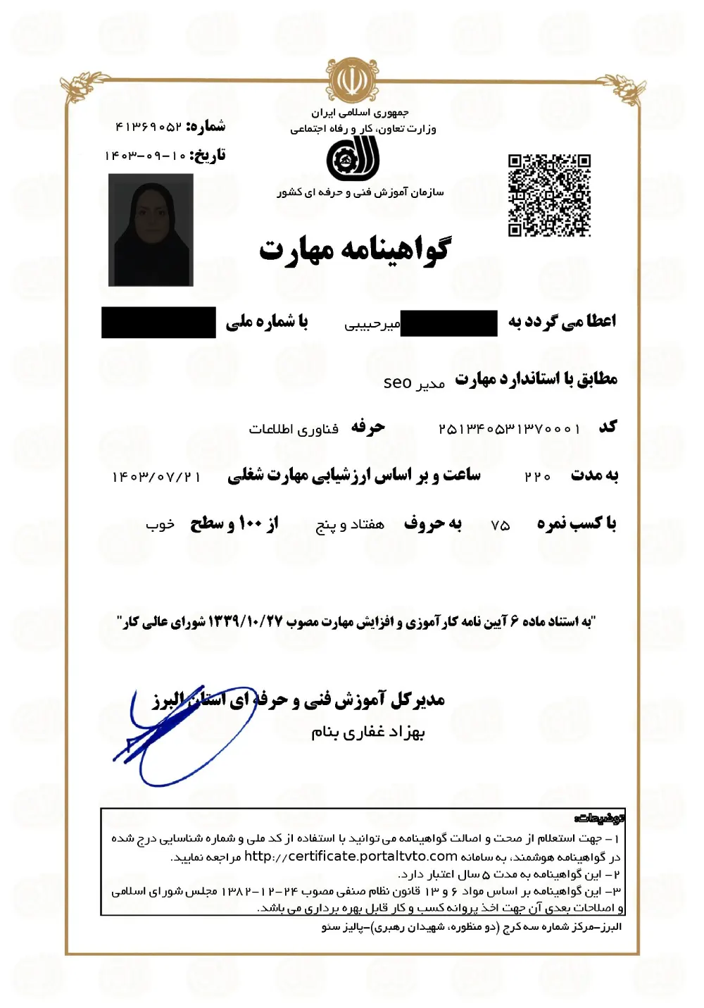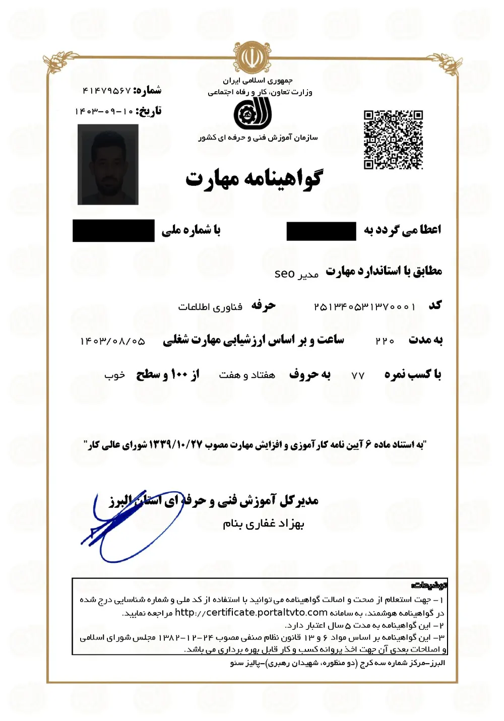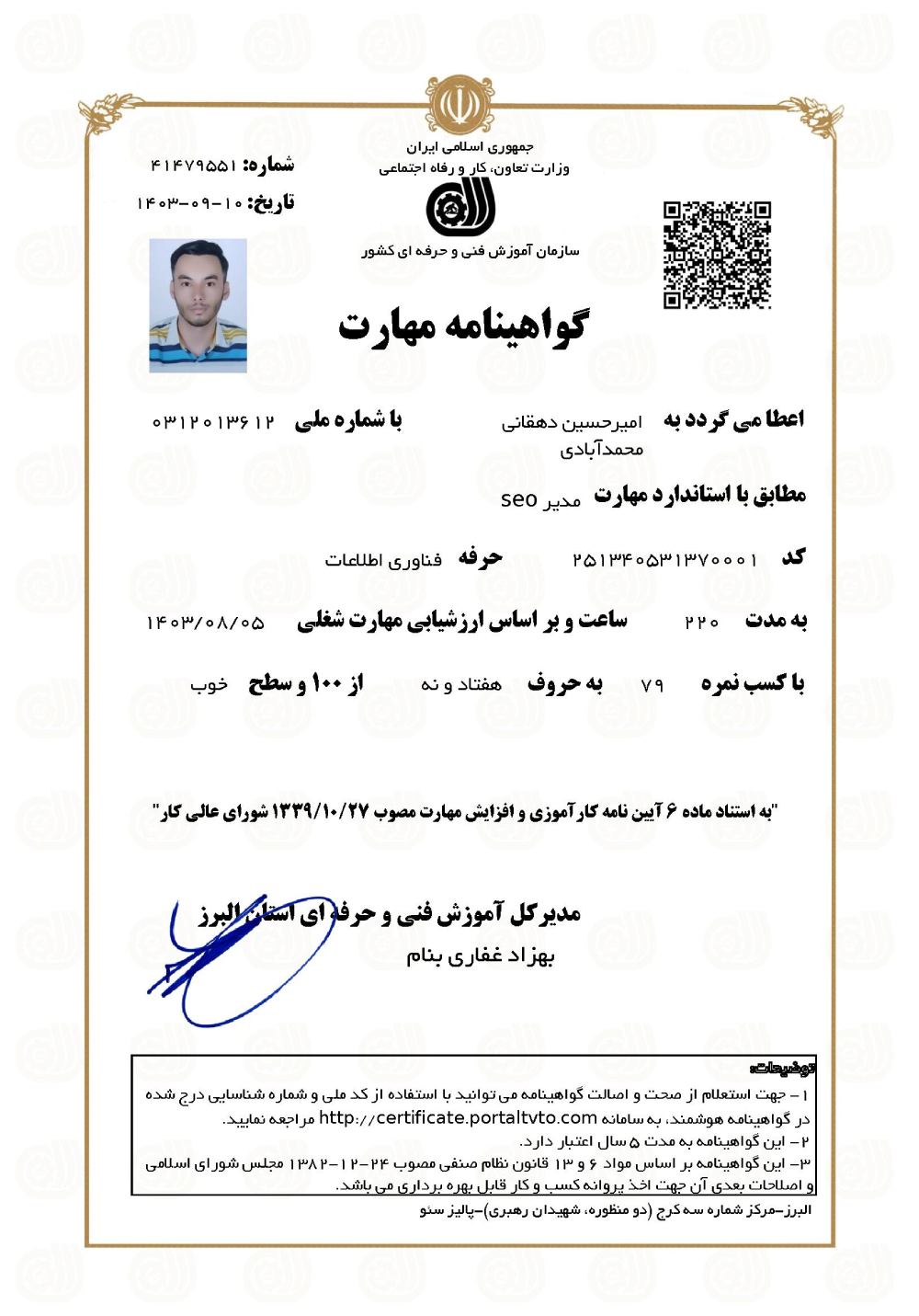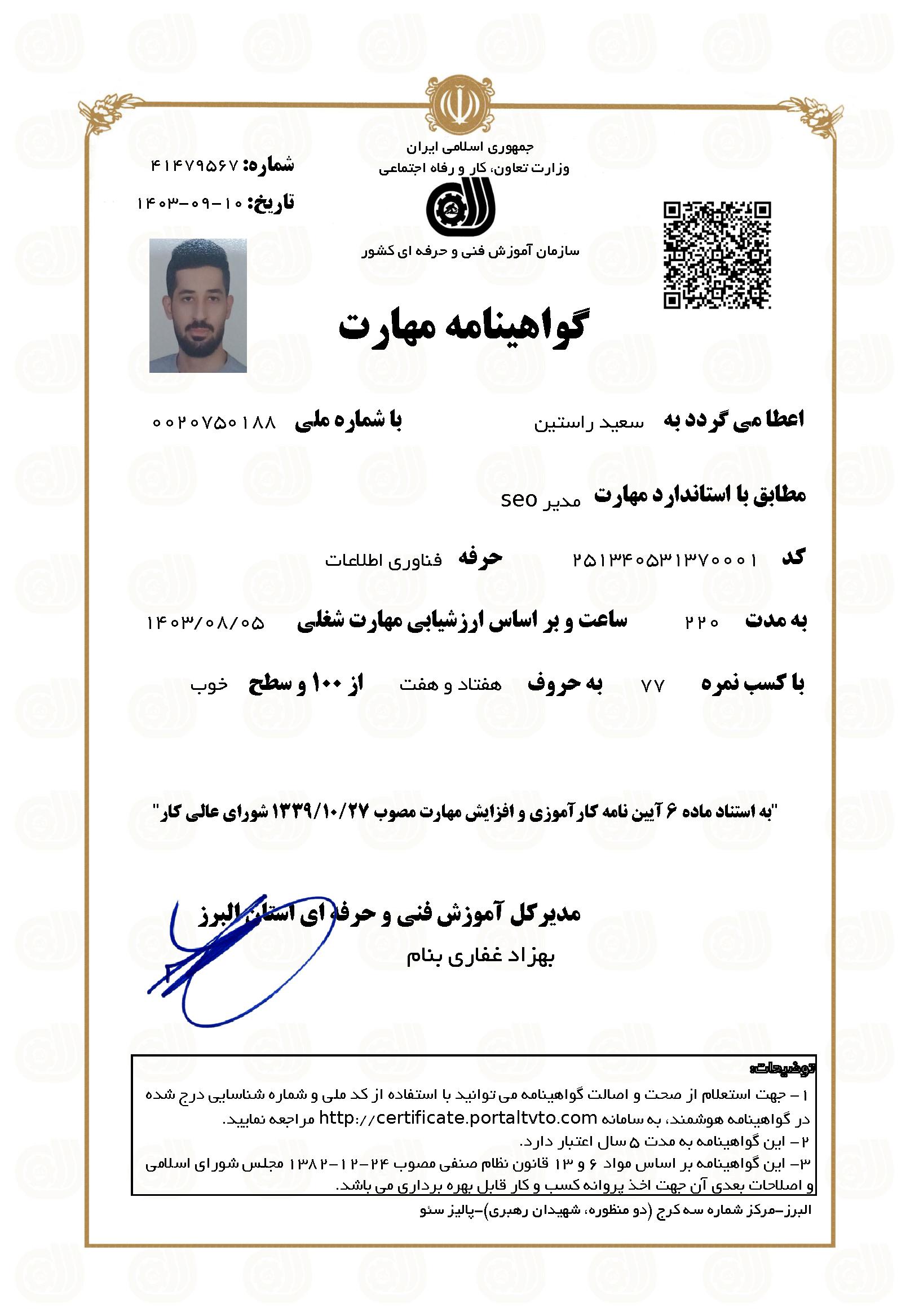برای اولین بار در استان البرز، پالیز سئو پس از تکمیل دوره آموزشی به دانشجویان خود مدرک معتبر فنی و حرفه ای اعطا خواهد کرد.